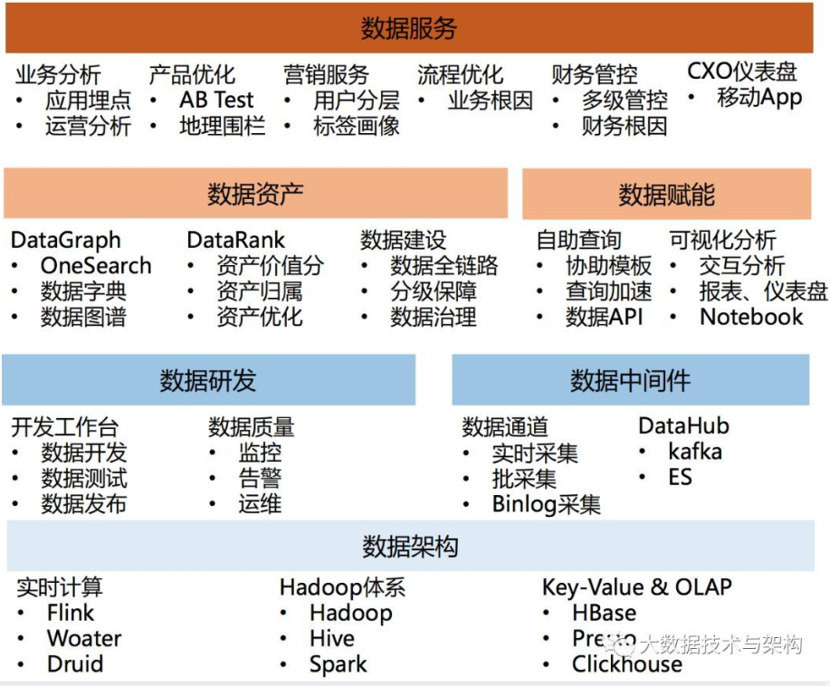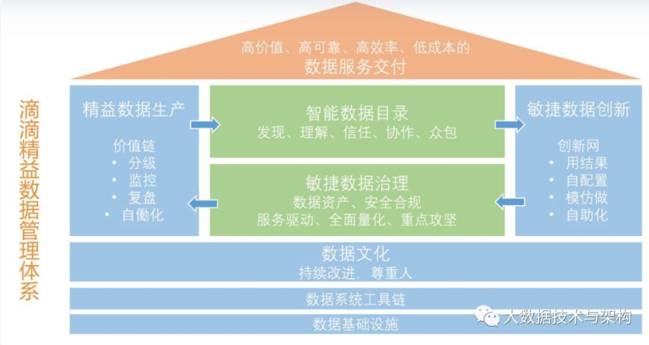 滴滴的数据中台从底向上构建了包括数据基础建设,敏捷数据资产,数据治理,数据交付体系。