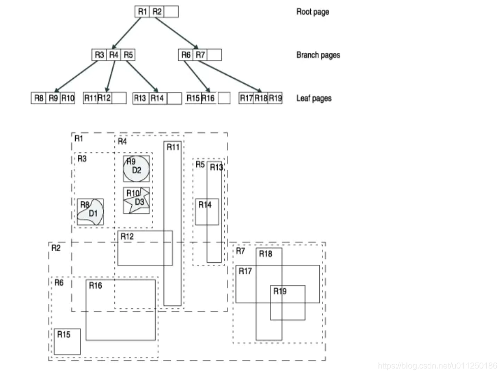 - 首先我们假设所有数据都是二维空间下的几何形状,图中仅仅标志了 R8,R9,R10 区域中的数据,其他的叶子节点仅仅用 MBB 表示。为了实现 R 树结构,我们用一个最小边界矩形恰好框住这个不规则区域,这样,我们就构造出了一个区域:R8。R8 的特点很明显,就是正正好好框住所有在此区域中的数据。其他实线包围住的区域,如 R9,R10,R11 等都是同样的道理。这样一来,我们一共得到了 12 个最最基本的最小矩形。这些矩形都将被存储在子结点中。
