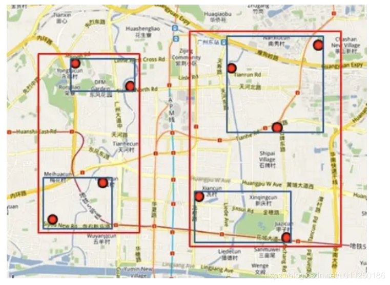 - 最后选择天河城所在的那个区域(对应叶子结点,存放有最小矩形),遍历所有在此区域内的结点,看是否满足我们的要求即可。