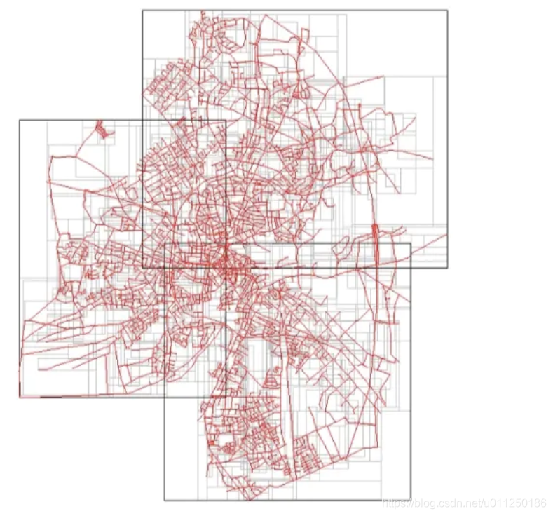 假设我们有一个地图路网要进行道路的快速索引,那么我们可以将每一条路的最小 MBB 作为 R 树的数据单元来进行构建 R 树。