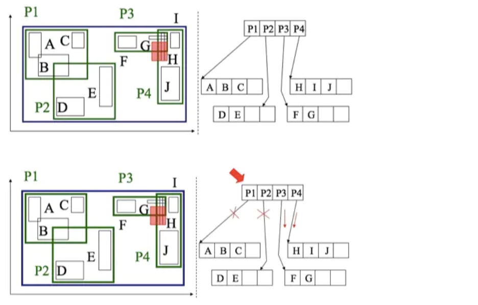 红色查询区域与 P3 子树 P4 子树相重叠,所以根据“缩小空间”的思想,只需要遍历 P3 和 P4 所在子树就行而无需遍历 P1,P2.