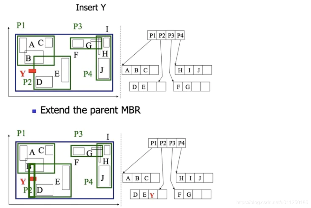 需要增大 MBR 的插入情况,由于插入的 y 所在的区域 P2 的数据条目仍然有足够的空间容纳条目 y,但是 y 的区域面积即 MBR 并不完全位于 P2 的区域之内,因此我们在插入数据 y 后会导致 P2 区域的相应扩大。