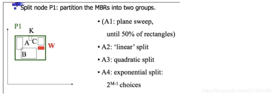 (-_-)!!!所以分裂的具体情况还是很复杂的,真想不懂这些大神怎么会想得到这些。除了上述 Quadratic 的分裂算法之外还有其他的分裂算法,如下图中间图,但是分裂的效果都不如 R*树(R 树的改进版)的算法好。