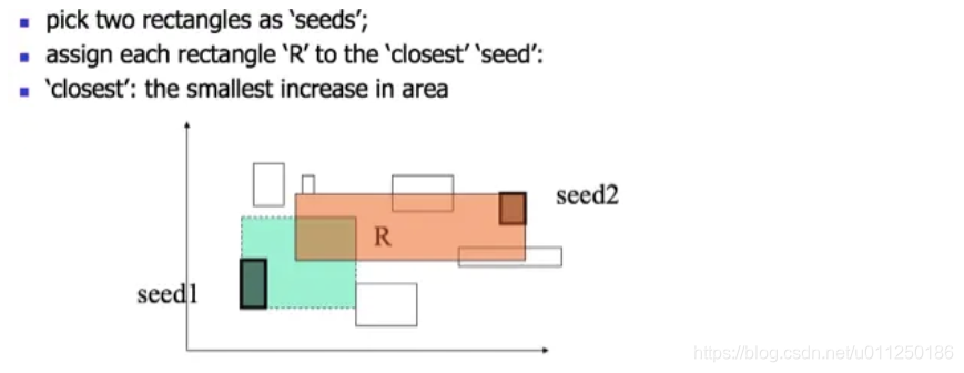 挑选出 seed1 和 seed2 之后,就将剩下的要分配的分裂条目分个这两个 seed 使它们各称为一个组。而这个分配的原则就是离谁比较“近”就和谁一组。这里的“近”指的是任何一个条目 MBB--E 和 seed1,seed2 分别计算可以包裹着 E 和 seed1 的最小限定框 J1=MBR(E,seed1), 可以包裹着 E 和 seed2 的最小限定框 J2=MBR(E,seed2)。再分别计算增量 d1=J1-E-seed1,d2=J2-E-seed2。d1,d2 哪个小就说明哪个“近”。