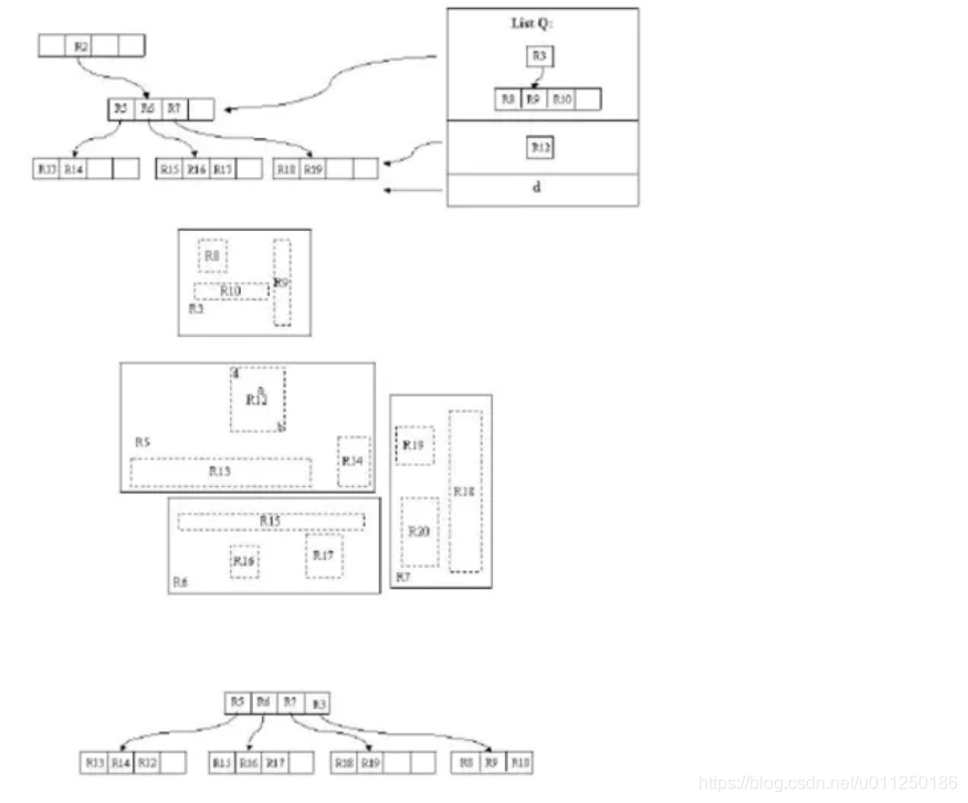 有一点需要解释的是,我们发现这个删除操作向上传递之后,根结点的条目 R1 也被插入了 Q 中,这样根结点只剩下了 R2。别着急,重新插入操作会有效的解决这个问题。我们插入 R3,R12,d 至它原来所处的层。这样,我们发现根结点只有一个条目了,此时根据 Inert 中的操作,我们把这个根结点删除,它的孩子结点,即 R5,R6,R7,R3 所在的结点被置为根结点。至此,删除操作结束。