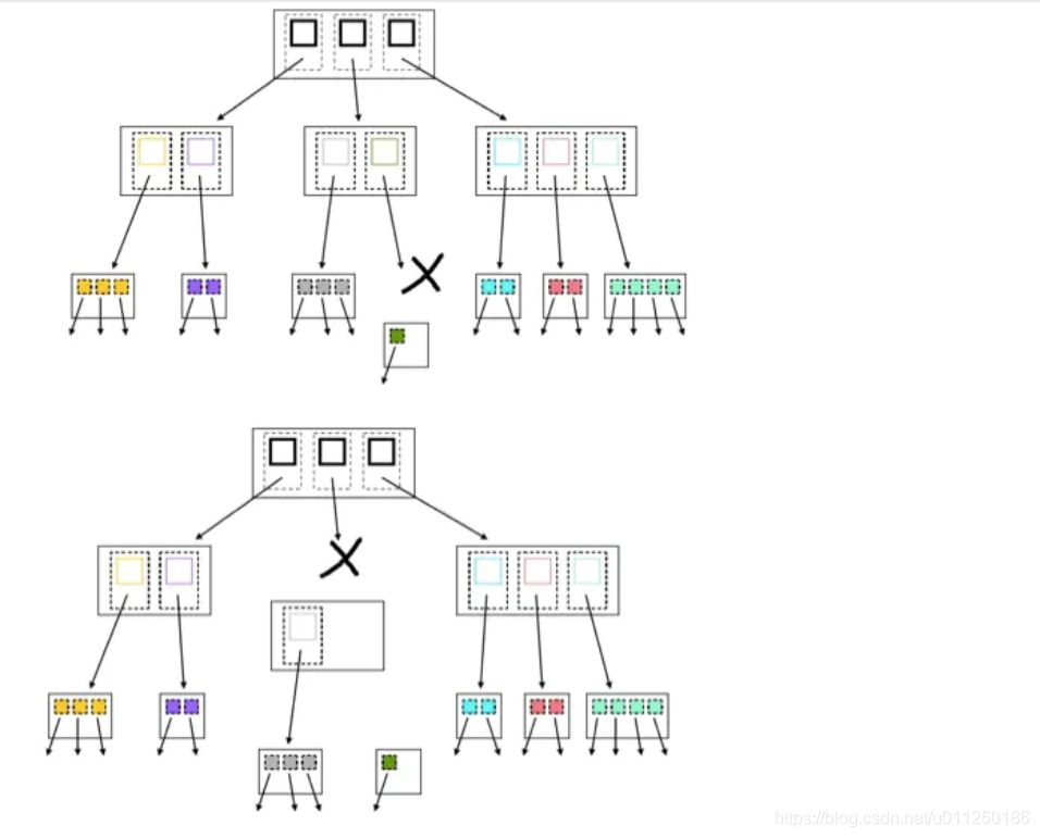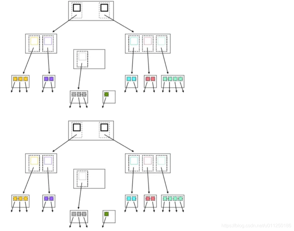 - I4:[对树进行增高操作] 如果结点分裂,且该分裂向上传播导致了根结点的分裂,那么需要创建一个新的根结点,并且让它的两个孩子结点分别为原来那个根结点分裂后的两个结点。