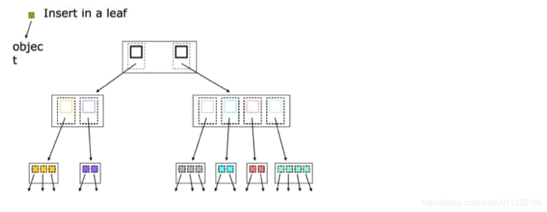 - 2. 对于所有在叶子中存储的记录(条目),I 是最小的可以在空间中完全覆盖这些记录所代表的点的矩形(注意:此处所说的“矩形”是可以扩展到高维空间的)。