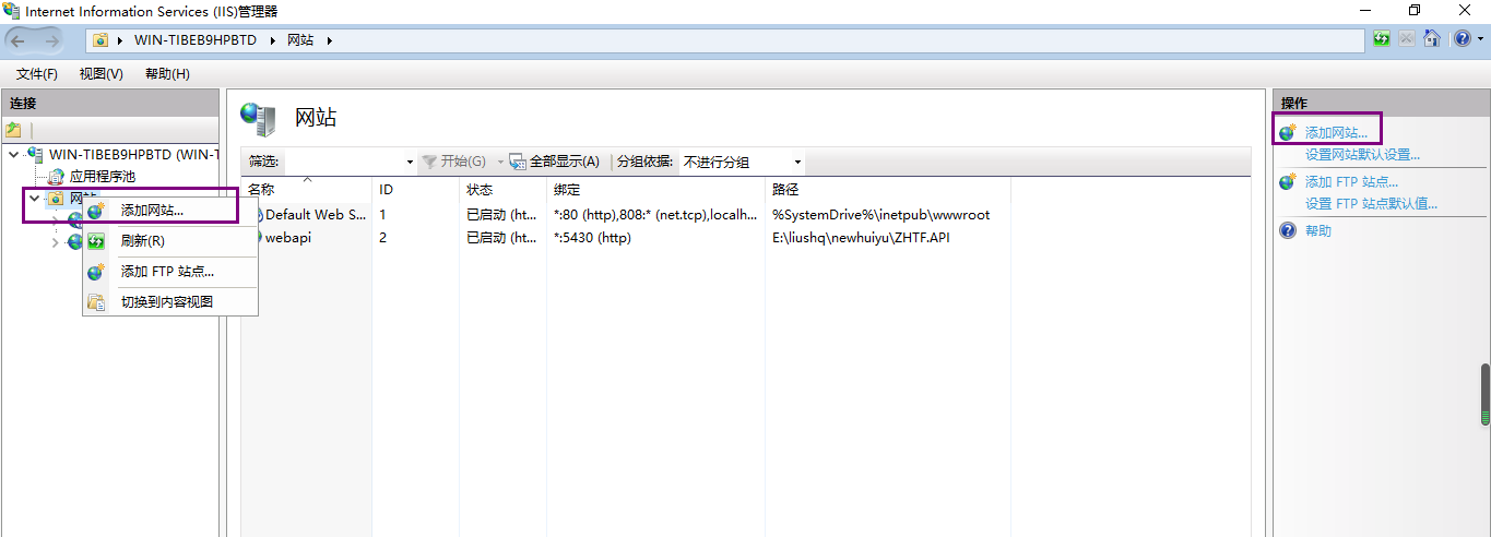 3、打开IIS,点击网站,右键,点击添加网站,或者点击右侧的添加网站选项