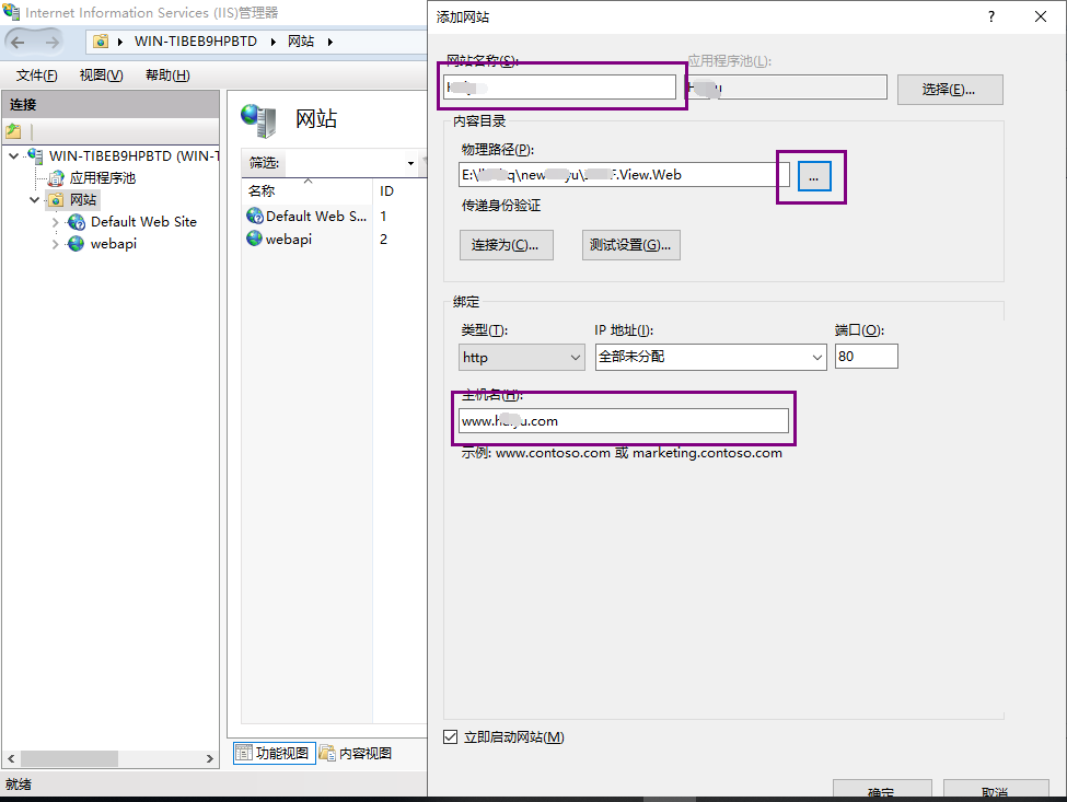 4、在打开的添加网站中,输入网站名称、选择物理路径(就是之前记下的项目路径)、主机名