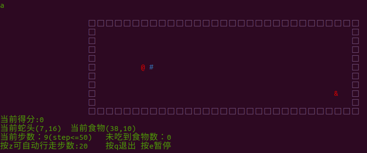 { //--捕获键盘//c_(键盘捕获值) c(当前运行值) c__(键盘锁存值)static char GetCExit=0;static char GetCha=0;static int GetTime=30;static char c='a'; static char LockFlag=1;//锁存标志#ifdef AUTOGOstatic char c_='z';static char c__='z';#else static char c_='d';static char c__='a';#endifGetTime=30;while(GetTime--){//捕获时隙if(kbhit()) { GetCha=readch();//getchar(); if((c_=='z'||c_=='Z')&&!LockFlag&&(a>=0)){ //退出自动运行 if(GetCha=='z'||GetCha=='Z'){c_=c__;c=c_;//还原原来的方向LockFlag=1;}//自动运行中断if(GetCha=='e'||GetCha=='E') {getchar(); // system("pause"); //暂停break;}c=GetCha;break;}c_=GetCha;//if((c_=='z'||c_=='Z')&&LockFlag&&(a>0)) { c__=c;LockFlag=0;c=autogo();a--;break;}if((c_=='e'||c_=='E')){getchar(); //system("pause"); //暂停break;}//c=c_;break; }}if((c_=='z'||c_=='Z')&&LockFlag&&(a>0)) { c__=c;LockFlag=0;c=autogo();a--;}usleep(ORDINARY*200000);//调节该时间可以进行时间难度控制gotoxy(0,0);putchar(c);//--if(h->x<=YStart||h->x>=YEnd||h->y<=XStart||h->y>=XEnd) gameover(); //撞墙判断switch(c){case 'W':case 'w':{{s_sub(-1);s_add_h(h->x-1,h->y);step++; }break; }case 'S':case 's':{ {s_sub(-1);s_add_h(h->x+1,h->y);step++;}break;}case 'A':case 'a':{{s_sub(-1);s_add_h(h->x,h->y-1);step++;}break; }case'D':case 'd':{{ s_sub(-1);s_add_h(h->x,h->y+1);step++; } break; }case'Q':case 'q':{ system("clear"); colorf(34); // system("color 0a");printf("\033[38m\n\r\n\r\n\r\n\r\n\r\n\r\n\r\n\r\n\r\n\r\n\r\n\r\n\r\t\t\t退出?('y' or 'n')\n\r\t\t\t\t");GetCExit=getchar(); if(GetCExit=='y'||GetCExit=='Y') {printf("\t\t\t\n\r"); close_keyboard();exit(0); }else {system("clear");s_play(h,ALLDISP); colorf(34); //system("color 09");}}}if(h->x<=YStart||h->x>=YEnd||h->y<=XStart||h->y>=XEnd) gameover(); //撞墙判断if((h->x==n&&h->y==m)||(t->x==n&&t->y==m)) { s_add_t(t->x,t->y+1); step=0;score++;f=1;// printf("\007"); // Beep(500,200);printf("\a");//发出ALERT声音if(a<AutoStepNum) a=AutoStepNum;else a+=AutoStepWidth; } //吃到食物,增加节点,并重新放置食物if(step==50) { step=0;f=1;foodlose++;// printf("\007"); // Beep(1500,200);printf("\a"); }//走完u步未吃到食物则更新食物//s_play(h,PARTDISP);if(c_=='z'||c_=='Z') { if(a>0) {c=autogo();a--;} else{c_=c__;c=c_;//还原原来的方向LockFlag=1;}}