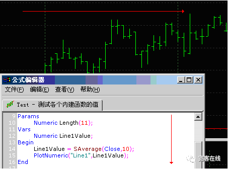 如果交易策略是基于Bar数据回测。按照Bar数据的Bar数目,从第一个Bar到最后一个Bar,依次进行计算,如果公式中出现了调用Bar数据函数的,则取出当前Bar的相应值,进行运算。如下图箭头所示,公式执行从上至下,Bar从左到右执行。