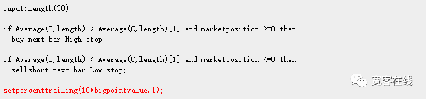 我举一个很简单的例子做范例说明。策略描述:当均线往上时往上触碰现在K线高点时作多、当均线往下时往下触碰现在K线低点时放空,另外加上移动出场─当获利大于等于10点后,折返获利1%就出场。