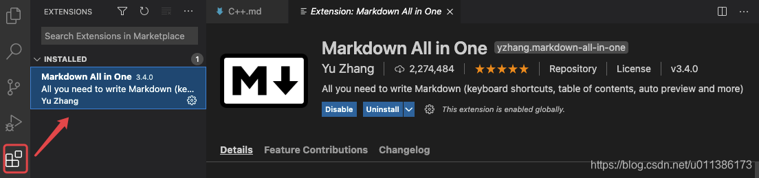 2、打开VSCode,点击扩展,搜索Markdown All in one插件,安装