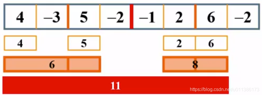 - 下一步,我们来看跨越分割线的最大值,首先是4,-3,5,-2这4个数。从-3开始向左,得到最大的值(1)要加到4;然后向右,得到最大的值为5,这样得到跨越边界的最大值为6(即4+(-3)+5)。比较红线左侧得到的最大值4、5、6,得到最大值为6。同理我们可以得到右侧的最大值为8.