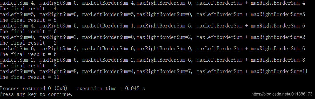 {/*分治法求List[left]到List[right]最大子列和*/int maxLeftSum; //存放左子问题的解int maxLeftBorderSum; //存放左边跨边界的结果int maxRightSum; //存放右子问题的解int maxRightBorderSum; //存放右边跨边界的结果int leftBorderSum; //存放做左子问题跨边界的解int rightBorderSum; //存放右子问题跨边界的解if(left == right) //递归终止条件,子列只有1个数字{if(List[left] > 0) return List[left];else return 0;}int mid = (left + right) / 2;/*递归求得两边子列的最大和*/maxLeftSum = divideAndConquer(List, left, mid);maxRightSum = divideAndConquer(List, mid+1, right);/*求解跨分界线的最大子列和*/maxLeftBorderSum = 0;leftBorderSum = 0;int i;for(i = mid; i >= left; i--) /*从中线向左扫描*/{leftBorderSum += List[i];if (leftBorderSum > maxLeftBorderSum)maxLeftBorderSum = leftBorderSum;} /*左边扫描结束*/maxRightBorderSum = 0;rightBorderSum = 0;int j;for (j = mid+1; j <= right; j++) /*从中线向右扫描*/{rightBorderSum += List[j];if (rightBorderSum > maxRightBorderSum)maxRightBorderSum = rightBorderSum;}/*右边扫描结束*/printf("maxLeftSum=%d, maxRightSum=%d, maxLeftBorderSum=%d,maxRightBorderSum=%d, maxLeftBorderSum + maxRightBorderSum=%d\n",maxLeftSum, maxRightSum, maxLeftBorderSum,maxRightBorderSum,maxLeftBorderSum + maxRightBorderSum);int result = max3Num(maxLeftSum, maxRightSum, maxLeftBorderSum + maxRightBorderSum);printf("The final result = %d\n", result);return result;