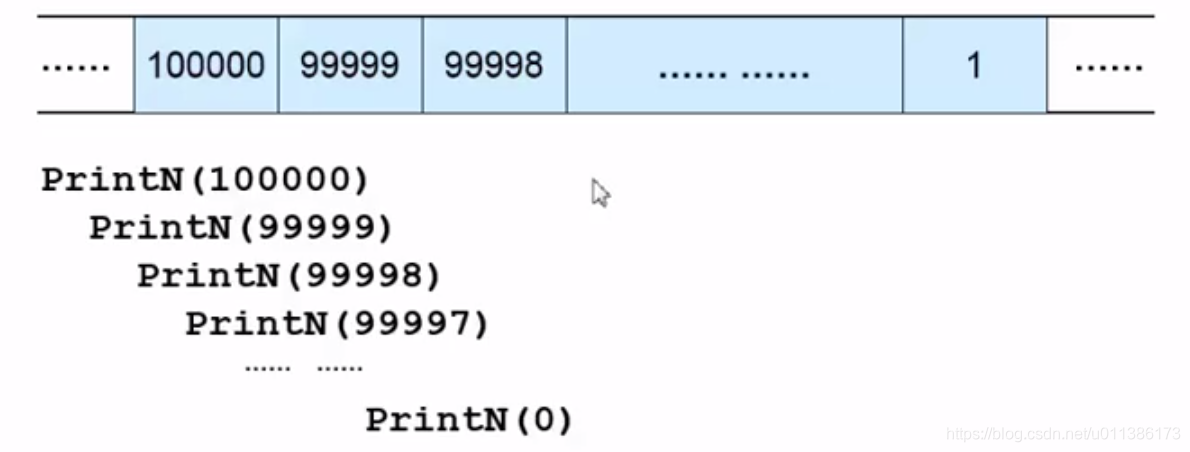 当N大到一定的值时,递归实现的cmd中仅会出现输入的值,而不会输出打印结果。因为递归函数把它能用的空间全部吃掉,还不够吃,所以它就爆掉了,还来不及打印任何数字,就非正常终止了。计算机是不愿意跑递归程序的,因为递归的程序对空间的占用有的时候可能是很恐怖的。(调用其他函数时要先保存当前状态,所以递归程序就在不断的保存当前状态)