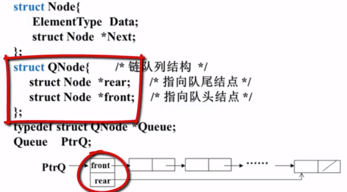 {struct Node *rear; //指向队尾结点struct Node *front; //指向队头结点