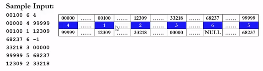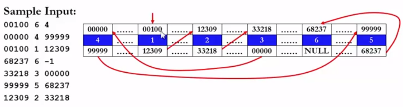 样例输入可以模拟一个真实的链表在内存里存在状态,开一个结构数组来代表内存空间,样例输入中的位置就是在数组中的下标,指针其实就是一个整数,记录的是下一个结点在数组中的下标。