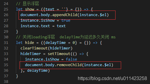 可以看到,在定义hide的那个方法里面,我们接受了一个叫做delayTime的参数,也就是说我们在使用这个方法的时候,我们应该这样传递:this.$vLoading.hide({delayTime: 800})。可是我们为啥要这样子传一个对象进去?而不是直接this.$vLoading.hide(800)这样子,毕竟这里只有一个参数而已?这样子做其实是为了代码的可读性,别人一看就知道,哦这里是延迟了800ms就hide浮层。
