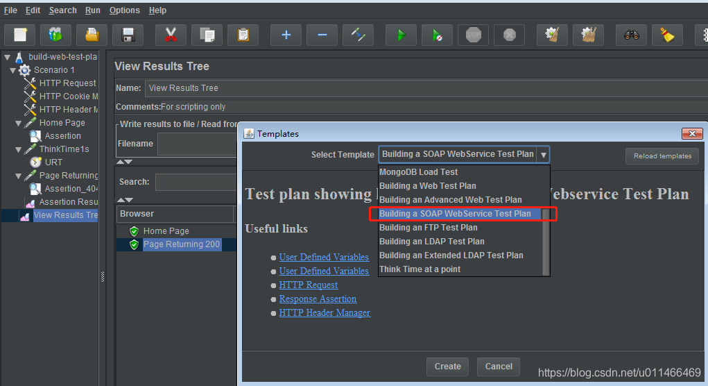 1、同样的操作步骤,启动JMeter-GUI模式,点击空白页盘边的绿色模版按钮,创建Soap webservice测试计划,那么也有advanced web test plan<构建高级web测试计划>: