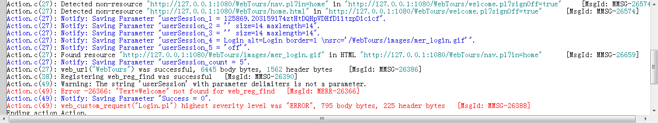 Action(){web_set_max_html_param_len("12040");web_reg_save_param("userSession","LB=value=","RB=>","NotFound=ERROR","Search=Body","Ord=ALL",LAST);web_url("WebTours","URL=http://127.0.0.1:1080/WebTours/","Resource=0","RecContentType=text/html","Referer=","Snapshot=t1.inf","Mode=HTML",LAST);web_reg_find("Fail=NotFound","Search=Body","SaveCount=Success","Text=Welcome",LAST);web_custom_request( "Login.pl","URL=http://127.0.0.1:1080/WebTours/login.pl","Method=POST","Body=userSession={userSession}&username=jojo&password=bean&login.x=59&login.y=8&JSFormSubmit=off","Mode=HTML",LAST);lr_output_message("-----------------------token为:%s",lr_eval_string("{userSession}"));return 0;