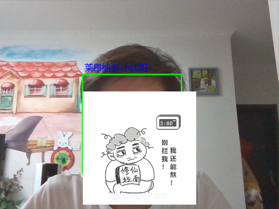 minH = 0.1 * cam.get(4)while True:ret, img = cam.read()gray = cv2.cvtColor(img, cv2.COLOR_BGR2GRAY)faces = faceCascade.detectMultiScale(gray,scaleFactor=1.2,minNeighbors=5,minSize=(int(minW), int(minH)))for (x, y, w, h) in faces:cv2.rectangle(img, (x, y), (x + w, y + h), (0, 255, 0), 2)num, confidence = recognizer.predict(gray[y:y + h, x:x + w])if confidence < 100:name = names[num]# confidence = "{0}%".format(round(100 - confidence))# confidence = format(round(100 - confidence))else:name = "unknown"# confidence = "{0}%".format(round(100 - confidence))# confidence = format(round(100 - confidence))# 解决cv2.putText绘制中文乱码img = cv2ImgAddText(img, name, x + 5, y - 30)# cv2.putText(img, name, (x + 5, y - 5), font, 1, (0, 0, 255), 1) 无法显示中文# cv2.putText(img, str(confidence.encode('utf-8')), (x+5, y+h-5), font, 1, (0, 0, 0), 1)if name == "unknown":engine.say('识别失败')engine.runAndWait()else:engine.say(name + '同学,你好')engine.runAndWait()cv2.imshow('camera', img)k = cv2.waitKey(5)if k == 27:breakcam.release()