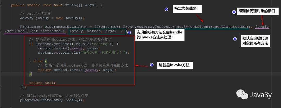 public class Main {public static void main(String[] args1) {// Java3y请水军Java3y java3y = new Java3y();Programmer programmerWaterArmy = (Programmer) Proxy.newProxyInstance(java3y.getClass().getClassLoader(), java3y.getClass().getInterfaces(), (proxy, method, args) -> {// 如果是调用coding方法,那么水军就要点赞了if (method.getName().equals("coding")) {method.invoke(java3y, args);System.out.println("我是水军,我来点赞了!");} else {// 如果不是调用coding方法,那么调用原对象的方法return method.invoke(java3y, args);}return null;});// 每当Java3y写完文章,水军都会点赞programmerWaterArmy.coding();}}