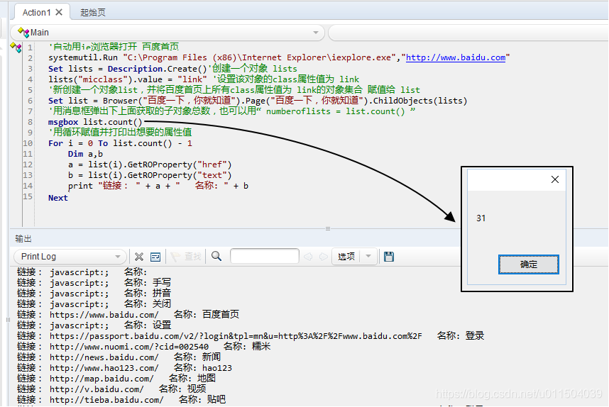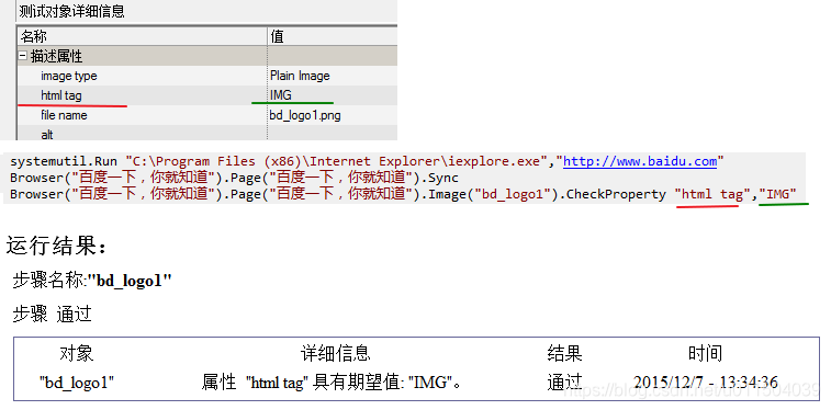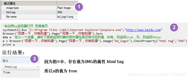 对象侦测器抓取对象时,file name有值:  3、CheckProperty 检查属性。 语法: CheckProperty (PropertyName,PropertyValue,[TimeOut]) CheckProperty:检查属性 PropertyName:属性名称 PropertyValue:对应名称属性的值 TimeOut:超时。可选  当该语句用于等式右边时,需要加上括号。如下图: 图①:Image对象的部分属性截图 图②:代码描述段 图③:执行代码段②的结果  4、ChildObjects 子对象 语法: ChildObjects([description]) Description:获取指定页面相同标属性的标签  5、Close 关闭。关闭指定对象  6、CloseAllTabs 关闭同一个浏览器窗口中所有的标签页 Browser("百度一下,你就知道").CloseAllTabs 7、DeleteCookies 删除浏览器的cookie 语法: DeleteCookies ([ FromSource ]) webUtil.GetCookies(url)  8、DialogExists、Exists 对话框/被测对象是否存在,返回Boolean类型的值:true、false 打开ie浏览器中的“管理加载项”对话框,执行下面一段代码,a = true 语法: Object. Exist([ timeout ])  9、EmbedScript、RunScript 嵌入脚本。嵌入的是JavaScript脚本。 与RunScript的区别 语法分别为: Browser("Browser").EmbedScript(Script). / Browser("Browser").EmbedScriptFromFile(FileName) Browser("Browser").Page("Page").RunScript(Script). / Browser("Browser").Page("Page").RunScriptFromFile(FileName) 假如要在百度首页的输入框赋值,可以调用JS代码。 首页要找到百度首页上输入框的id,然后用JavaScript中的getElementById()方法获取到需要赋值的对象:  RunScript:  EmbedScript:  10、Forward 效果等同于浏览器窗口上的【前进】按钮,使浏览器进入前一个页面  11、FullScreen 开启浏览器的全屏模式 12、OpenNewTab 在当前打开的浏览器窗口中打开新的tab页 Browser("百度一下,你就知道").OpenNewTab 13、WaitProperty 等到指定的对象属性达到指定值或超过指定的超时之前继续下一步,如省略超时不写,则默认系统设置的超时时间 语法: WaitProperty( properName,propertyValue[,timeout ]) properName:对象名 propertyValue:指定对象对应的值 timeout:等待超时时间上限  14、Activate 激活。激活对话框 语法: Object.Activate([ Button ]) Button:micLeftButton、micMiddleButton、micRightButton。可选  15、DblClick 双击事件 16、Drag 拖动事件 语法: Object.Drag(X,Y[, Button ]) 拖动某个对象,并指定拖动目标位置的X,Y坐标值。 Button:按钮,可选 17、Drop 执行指定部分进行拖放操作 语法: Object.Drop(X,Y[, Button ]) 18、GetTextLocation 检查指定的文本字符串是否包含在指定窗口区域 Object.GetTextLocation(TextToFind,[in,out] Left, [in,out] Top, [in,out] Right, [in,out] Buttom,[ MatchWholeWordOnly ]) TextToFind:需要查找的文本字符串 GetVisibleText 获取对话框相应的文字 19、GetROProperty、GetTOProperty、GetTOProperties 语法: | Object.GetROProperty(Property,[ PropertyData ]) | Object.GetTOProperty(Property) | Object.GetTOProperties | | GetROProperty:获取运行时指定对象的某个属性值 | GetTOProperty:获取对象库中指定对象的某个属性值 | GetTOProperties:获取对象库中指定对象的所有属性值 |