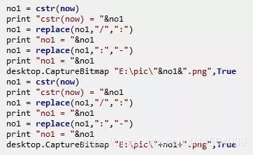 desktop.CaptureBitmap "E:\pic\"&no1&".png",Truedesktop.CaptureBitmap "E:\pic\"+no1+".png",True  |