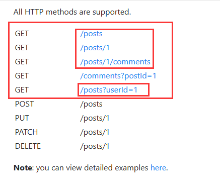 我要测试上面四个红圈内的接口,其中四个接口都是从/posts, 这个路径就是我们的basePath,baseURI就是http://jsonplaceholder.typicode.com