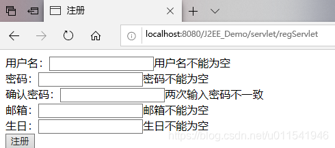 import java.util.Map;public class UserForm implements Serializable {private String username;private String password;private String repassword;private String email;private String birthday;private int id;private Map<String, String> msg = new HashMap<String, String>();public boolean validate() {//校验用户名输入if("".equals(username)) {msg.put("username", "用户名不能为空");}else if(!username.matches("\\w{3,8}")) {msg.put("username", "用户名为3—8位字母组成");}//校验密码输入if("".equals(password)) {msg.put("password", "密码不能为空");}else if(!password.matches("\\d{3,8}")) {msg.put("password", "密码为3—8位数字组成");}//校验两次密码输入是否一致if(!repassword.equals(password)) {msg.put("repassword", "两次输入密码不一致");}//邮件规则正则if("".equals(email)) {msg.put("email", "邮箱不能为空");}else if(!email.matches("^[A-Za-z\d]+([-_.][A-Za-z\d]+)*@([A-Za-z\d]+[-.])+[A-Za-z\d]{2,4}$")) {msg.put("email", "不是有效的邮箱格式");}//生日输入规则if("".equals(birthday)) {msg.put("birthday", "生日不能为空");}else {SimpleDateFormat sdf = new SimpleDateFormat("yyyy-MM-dd");try {sdf.parse(birthday);} catch (ParseException e) {msg.put("birthday", "请输入正确邮箱格式");}}return msg.isEmpty();// 当集合为空,全部条件验证通过,返回true}public Map<String, String> getMsg() {return msg;}public void setMsg(Map<String, String> msg) {this.msg = msg;}public String getUsername() {return username;}public void setUsername(String username) {this.username = username;}public String getPassword() {return password;}public void setPassword(String password) {this.password = password;}public String getRepassword() {return repassword;}public void setRepassword(String repassword) {this.repassword = repassword;}public String getEmail() {return email;}public void setEmail(String email) {this.email = email;}public String getBirthday() {return birthday;}public void setBirthday(String birthday) {this.birthday = birthday;}public int getId() {return id;}public void setId(int id) {this.id = id;}}