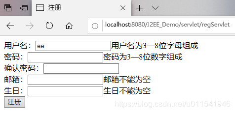<body><form action="${pageContext.request.contextPath}/servlet/regServlet" method="post">用户名:<input type="text" name="username" value="${uf.username}"/>${uf.msg.username}<br/>密码:<input type="password" name="password"/>${uf.msg.password}<br/>确认密码:<input type="password" name="repassword"/>${uf.msg.repassword}<br/>邮箱:<input type="text" name="email" value="${uf.email}"/>${uf.msg.email}<br/>生日:<input type="text" name="birthday" value="${uf.birthday}"/>${uf.msg.birthday}<br/><input type="submit" value="注册"></form>