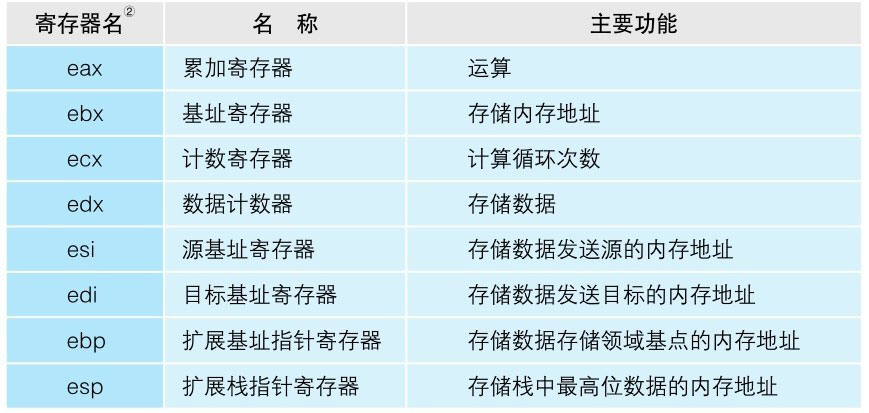 ②表10-2 中表示的寄存器名称是x86自带的寄存器名称。在第1章中表1-1列出的寄存器名称是一般叫法。两者有些不同,例如,x86的扩展基址指针寄存器就相当于第1章中介绍的基址寄存器。