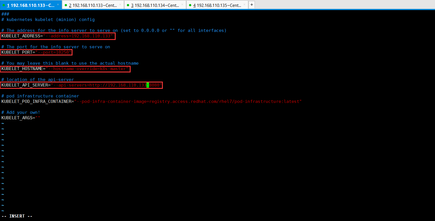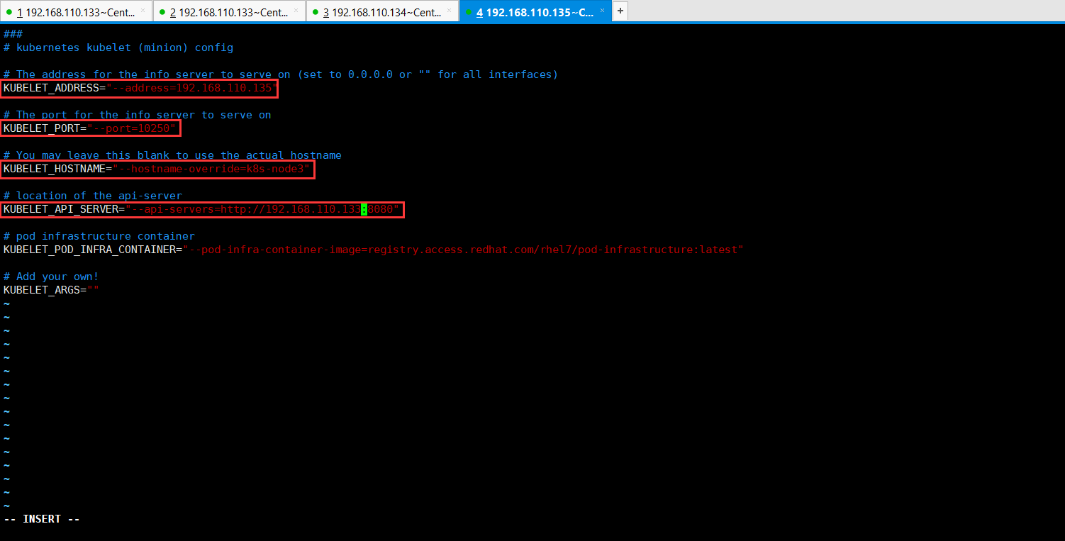 1 ###2 # kubernetes kubelet (minion) config3 4 # The address for the info server to serve on (set to 0.0.0.0 or "" for all interfaces)5 KUBELET_ADDRESS="--address=192.168.110.135"6 7 # The port for the info server to serve on8 KUBELET_PORT="--port=10250"9 10 # You may leave this blank to use the actual hostname 11 KUBELET_HOSTNAME="--hostname-override=k8s-node3" 12 13 # location of the api-server 14 KUBELET_API_SERVER="--api-servers=http://192.168.110.133:8080" 15 16 # pod infrastructure container 17 KUBELET_POD_INFRA_CONTAINER="--pod-infra-container-image=registry.access.redhat.com/rhel7/pod-infrastructure:latest" 18 19 # Add your own! 20 KUBELET_ARGS=""