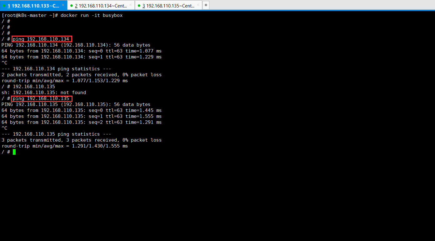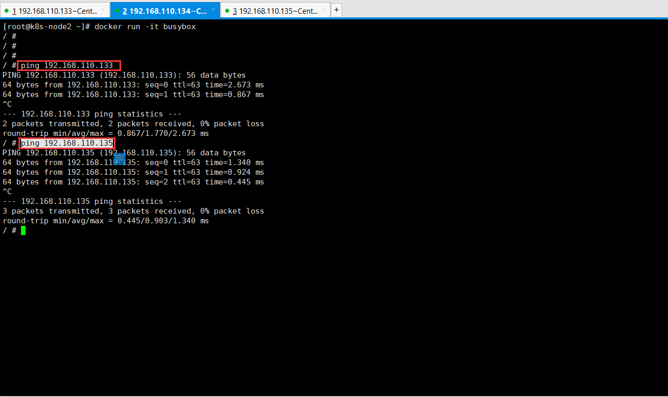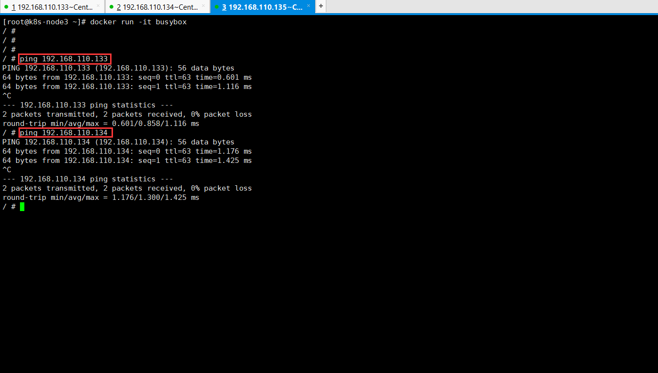 9、最后,测试跨宿主机容器之间的互通性。在所有节点执行docker run -it busybox。