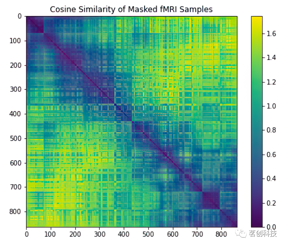 为了便于在大脑的统计连接背景下理解测地线,对被试1进行余弦相似性分析,并将得到的矩阵可视化。结果表明,当视觉刺激出现时,神经活动有高度重叠的区域。
