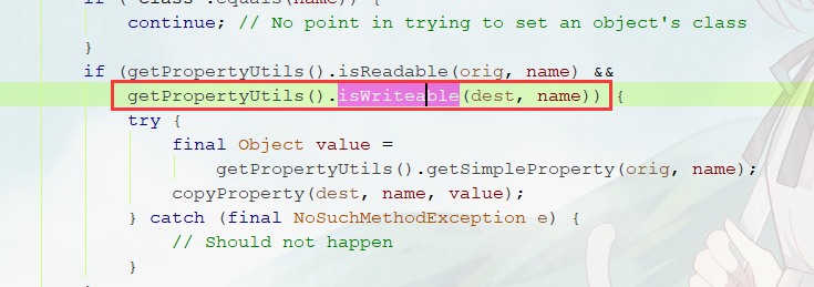 无论怎么执行始终赋值不成功 经过断点调试发现,下图的getPropertyUtils().isWriteable(dest, name) 始终为false