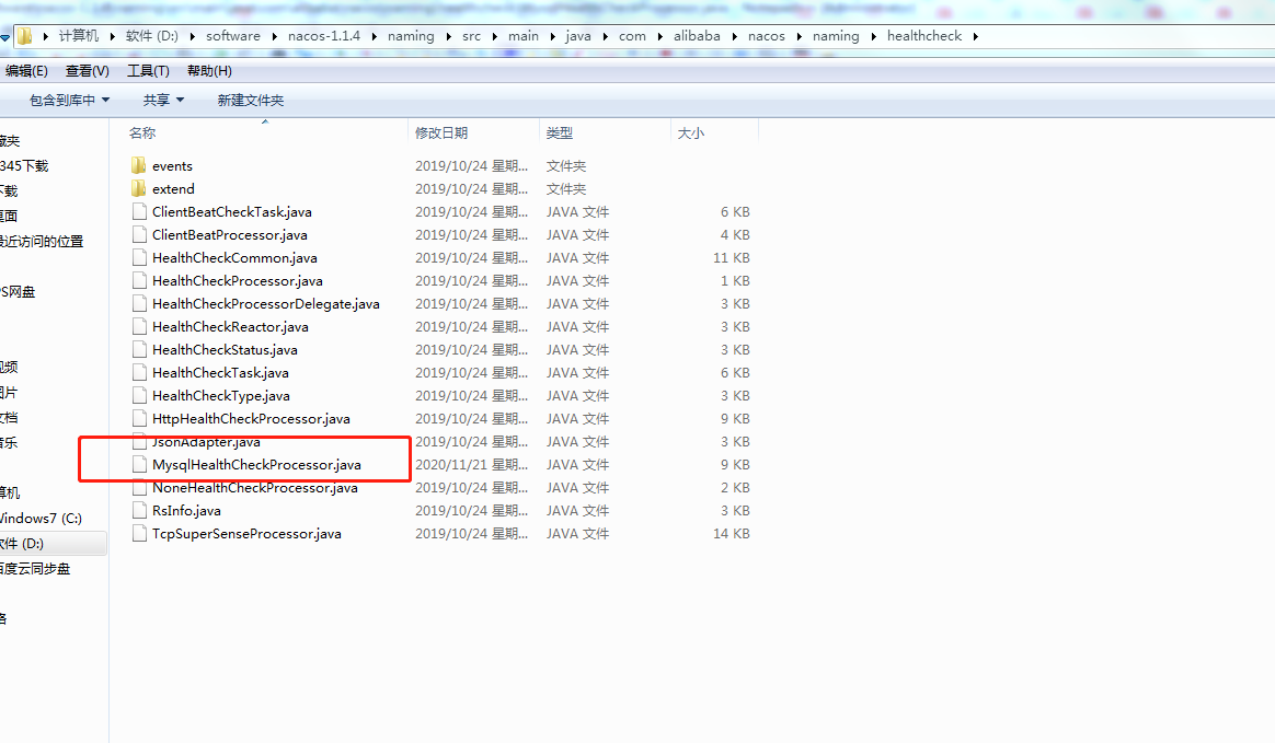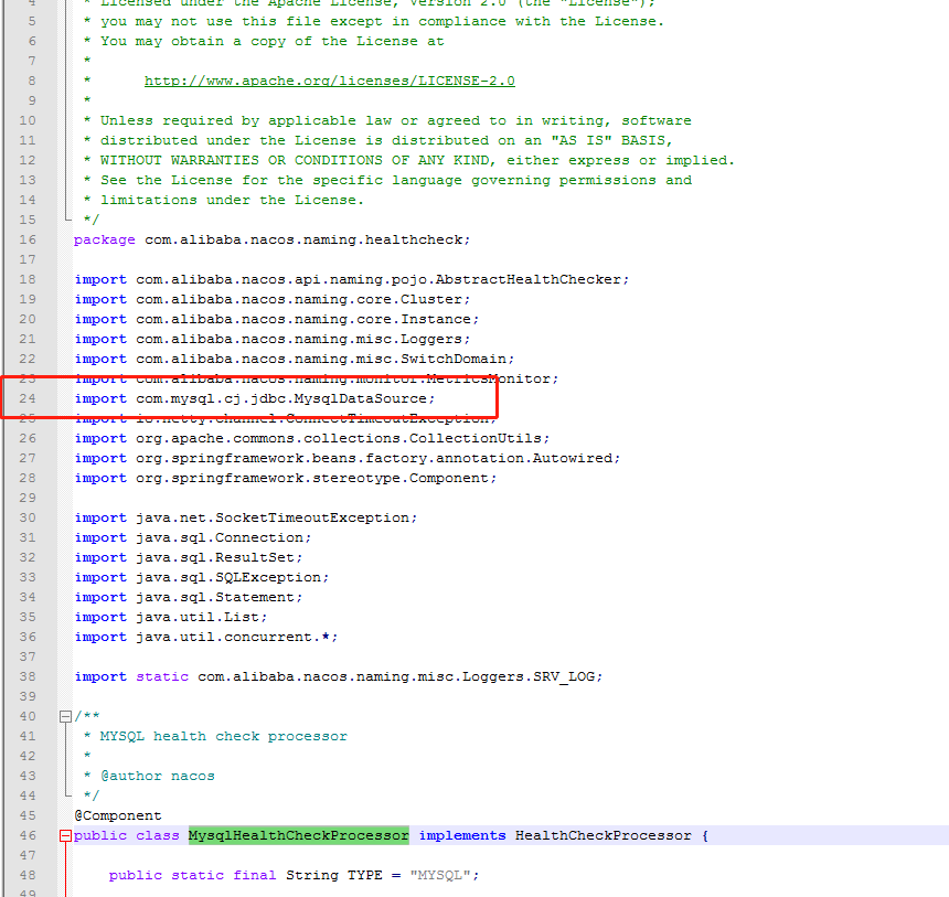 步骤2、修改D:\software\nacos-1.1.4\naming\src\main\java\com\alibaba\nacos\naming\healthcheck\MysqlHealthCheckProcessor.java文件内容