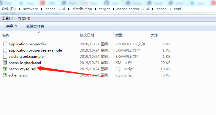 进到此目录后,新建nacos数据库,执行此脚本,可看到有11张表。