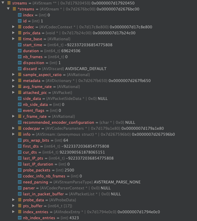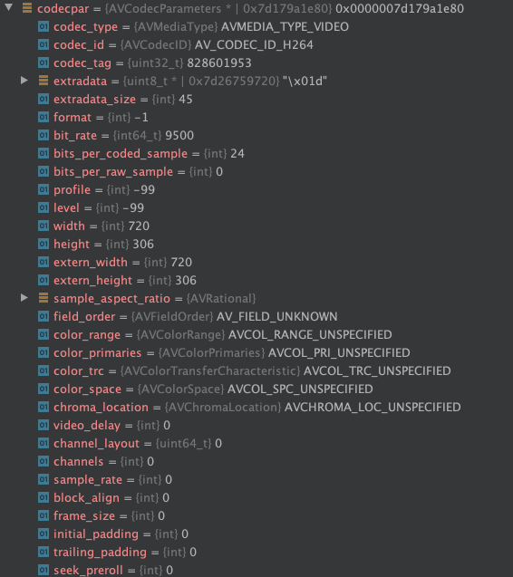 typedef struct AVStream {// 数组索引int index;// stream idint id;// 私有数据void *priv_data;// 时间基AVRational time_base;// 开始时间int64_t start_time;// 码流时长int64_t duration;// 帧数int64_t nb_frames;int disposition; /**< AV_DISPOSITION_* bit field */// 选择丢弃哪些packetsenum AVDiscard discard;// 宽高比AVRational sample_aspect_ratio;// 码流的元数据信息AVDictionary *metadata;// 平均帧率AVRational avg_frame_rate;// 封面信息AVPacket attached_pic;// 附加数据AVPacketSideData *side_data;int nb_side_data;int event_flags;AVRational r_frame_rate;// 编解码器参数AVCodecParameters *codecpar;int pts_wrap_bits;int64_t first_dts;int64_t cur_dts;int64_t last_IP_pts;int last_IP_duration;int probe_packets;int codec_info_nb_frames;/* av_read_frame() support */enum AVStreamParseType need_parsing;struct AVCodecParserContext *parser;// 索引数组AVIndexEntry *index_entries;// 索引数组长度int nb_index_entries;unsigned int index_entries_allocated_size;int stream_identifier;AVStreamInternal *internal;