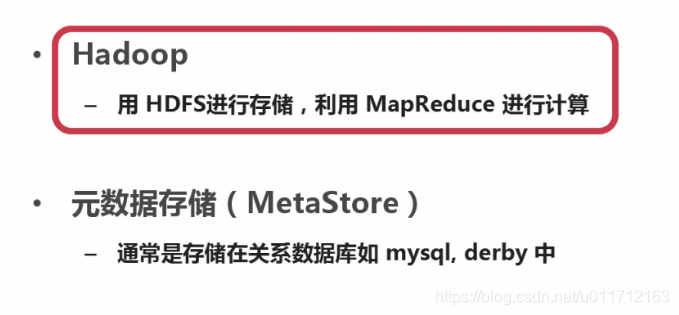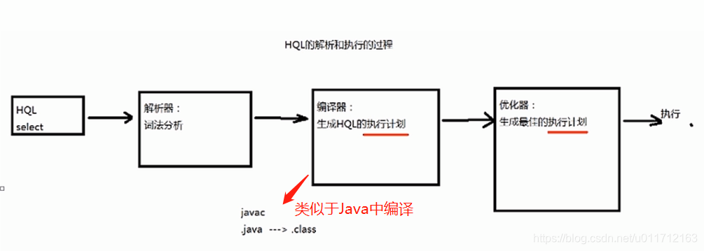 解释器、编译器、优化器完成HQL查询语句从词法分析、语法分析、编译、优化以及查询计划(Plan)的生成。生成的查询计划存储在HDFS中,并在随后有MapReduce调用执行。