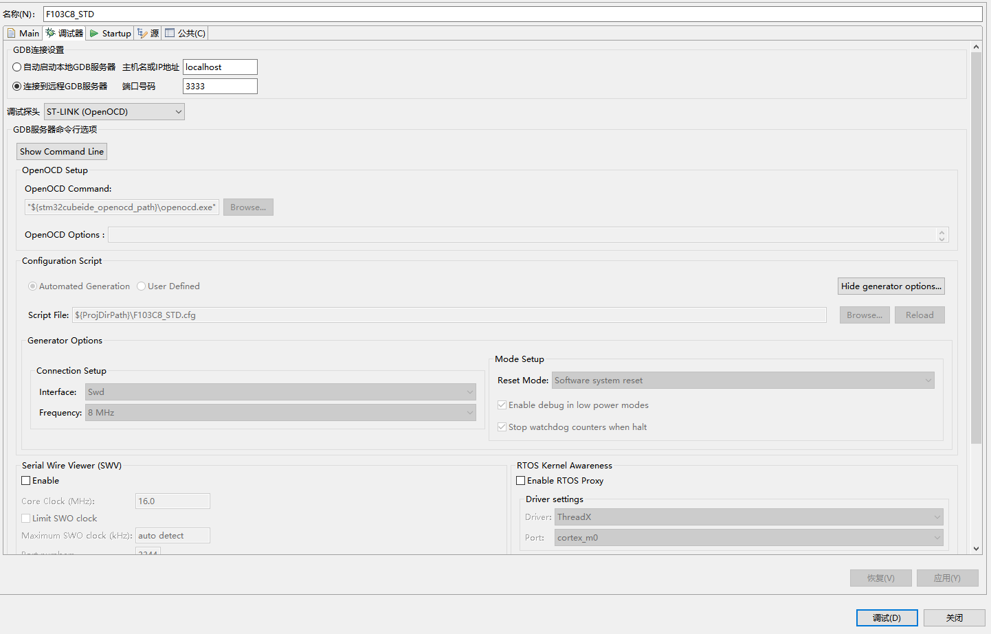 设置stm32cubeide的工程调试方案如下,选择连接远程GDB服务器(端口号3333),如果提示访问被目标计算机积极拒绝,可以调整Mode Setup中的Reset Mode为Software system reset(需要更改GDB连接设置为本地之后方可更改)