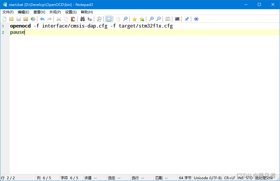 在openocd的bin目录下建立如下批处理文件。(stm32f1x.cfg根据自己的实际需求去更改,openocd自带多种芯片调试用的cfg文件)