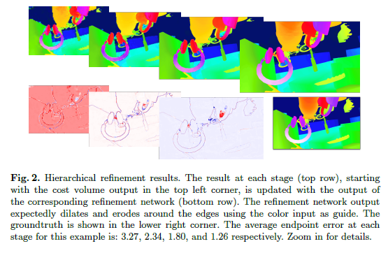 依赖粗匹配的不利之处在于,所产生的近视输出缺乏细节。 为了保持紧凑的网络设计,我们通过学习保留边缘的改善网络来解决这个问题。 我们注意到,该网络在此阶段的工作是,使用颜色信息输入作为指导来扩大或侵蚀视差值以融合到高频细节中,因此该紧凑型网络可以学习像素到像素的映射,类似最近的计算图像工作[8,7,20]是一种合适的方法。 具体来说,我们要求仅发现残差(或三角视差)的改善网络来添加或减去粗略预测。