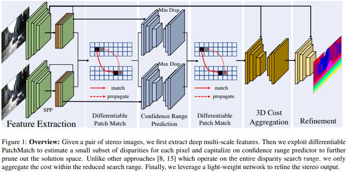 这篇文章,是2019年新的ICCV的papper,文章典型的使用了PatchMatch的思路,使得最后的速度快了很多。主要思路是:首先利用一种新颖的可微Patch Match算法来获得稀疏的cost volume。 然后,我们利用此表示来了解每个像素的修剪范围,自适应地修剪了每个区域的搜索空间。 最后,利用图像引导的优化模块来进一步提高性能。 由于所有组件都是可区分的,因此可以以端到端的方式训练整个网络。