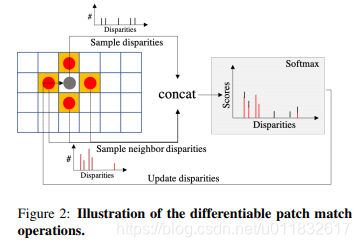 Deep Stereo Matching:为了进一步处理更复杂的现实世界场景,尤其是无纹理的区域或反射表面,现代方法利用CNN提取健壮特征[22]并进行匹配[40,41]。尽管这些技术已在基准测试中证明了出色的性能[11],但仍需要耗时的后处理。考虑到这一点,研究人员建议直接从给定的立体图像中回归亚像素视差[35、9、29]。通过将完整的传统立体声流水线实现为神经网络层,可以以端到端的方式训练这些模型,并能够在GPU上完全进行推理,从而大大提高了效率。不幸的是,由于成本和聚合的巨大规模,内存消耗和所需的计算仍然非常高,使得模型不切实际[15,8]。在本文中,我们的工作基于[15,8]。我们没有搜索完整的视差空间,而是利用新颖的可区分版本Patch Match来学习删减不太可能的匹配项并降低搜索空间的复杂性。我们的模型能够实时运行,同时保持可比的性能。
