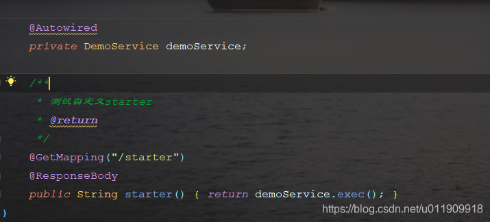 public class DemoAutoConfiguration {@Autowiredprivate DemoProperties properties;/*** @Bean 初始化 DemoService 实例* @return */@Beanpublic DemoService exec(){return new DemoService(properties.getDemoInfo());}}