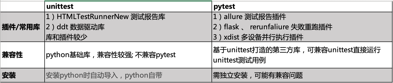 两种测试框架 对比一览表