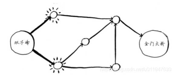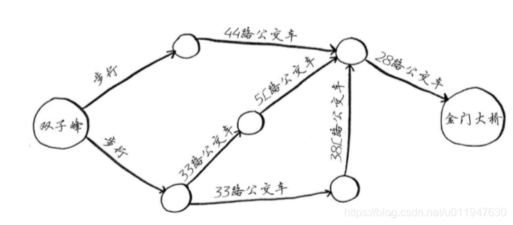 假设要从双子峰前往金门大桥。你想乘公交车前往,并希望换乘最少。可乘坐的公交车如下:
