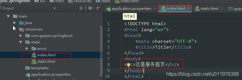 * 通过点击上面服务连接,默认classpath:index.html文件,static目录为静态资源存放目录,访问会自动解析